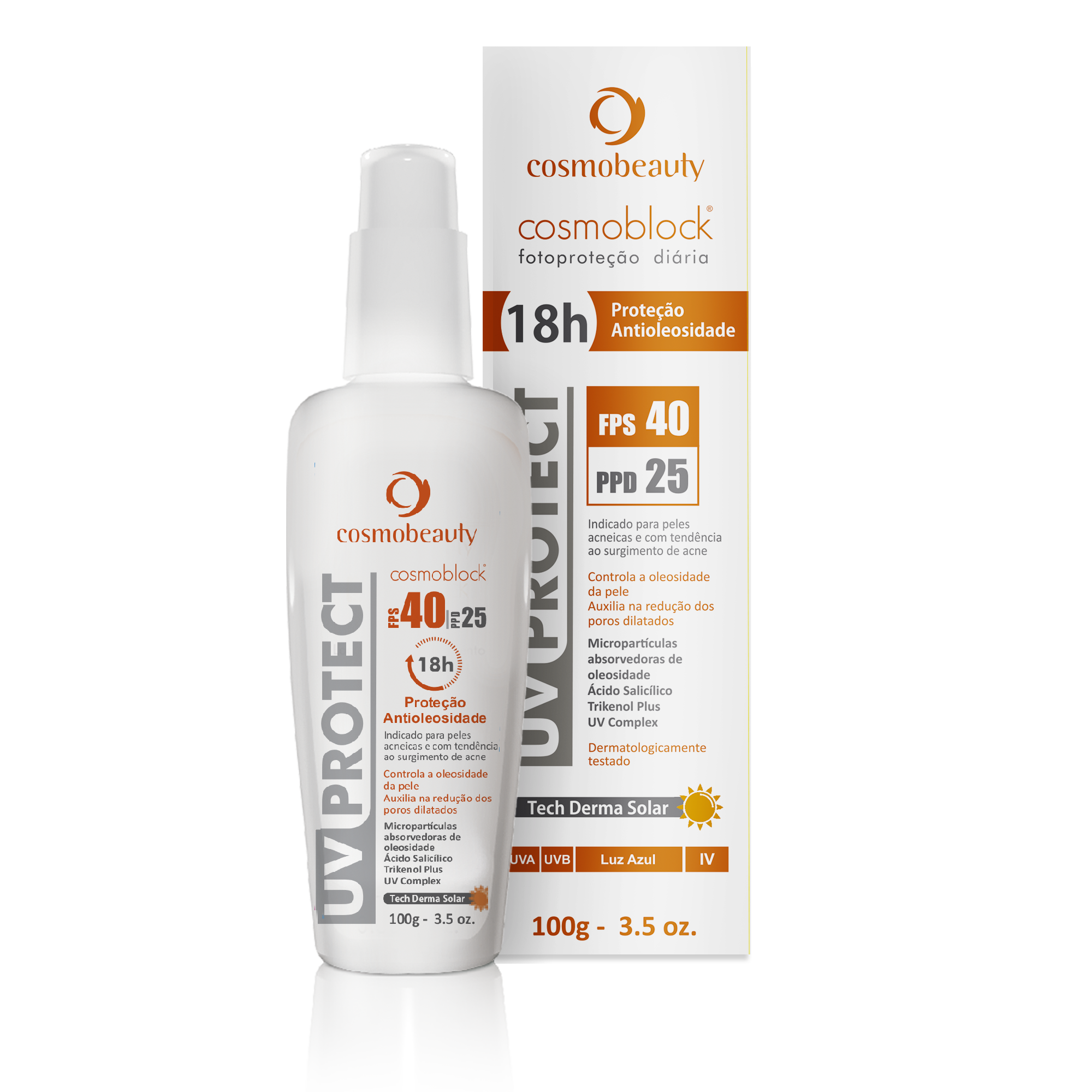 UV Protect FPS 40 Controle e proteção específica para pele acneica Foi desenvolvida especialmente para peles oleosas e acneicas. Reduz os poros dilatados e a acne inflamada. Com formulação de toque seco e efeito mate, se adapta rapidamente sem deixar residual sobre a pele. • Antiacne • Renovador • Rápida Absorção • Toque Seco • Antioleosidade • Redutor de Poros Ativos: UV Complex, Biosalix, Ácido Salicílico, Micropartículas absorvedores de oleosidade. Modo de uso: Aplicar em toda a face o UV Protect Control Fluid , e, massagear até completa absorção. Reaplicar sempre que desejar