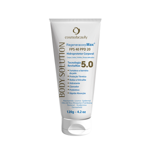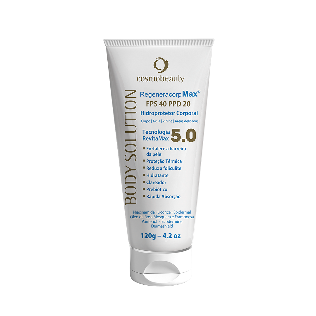 Regeneracorp Max FPS 40 PPD 20 Loção corporal que hidrata intensamente a pele e protege da radiação solar simultaneamente. A tecnologia Revitamax 5 nutre e reduz a desidratação e o ressecamento, fortalece a barreira, protetora e proporciona clareamento. Reduz a foliculite e deixa a pele nutrida e macia. Ativos: Niacinamida, Licorice, Epidermal, Óleo de Rosa Mosqueta e Framboesa, Pantenol, Ecodermine, Dermashield. Modo de usar: Aplique o Regenera Corp Max e massasgeie até completa absorção. Use sempre que desejar.
